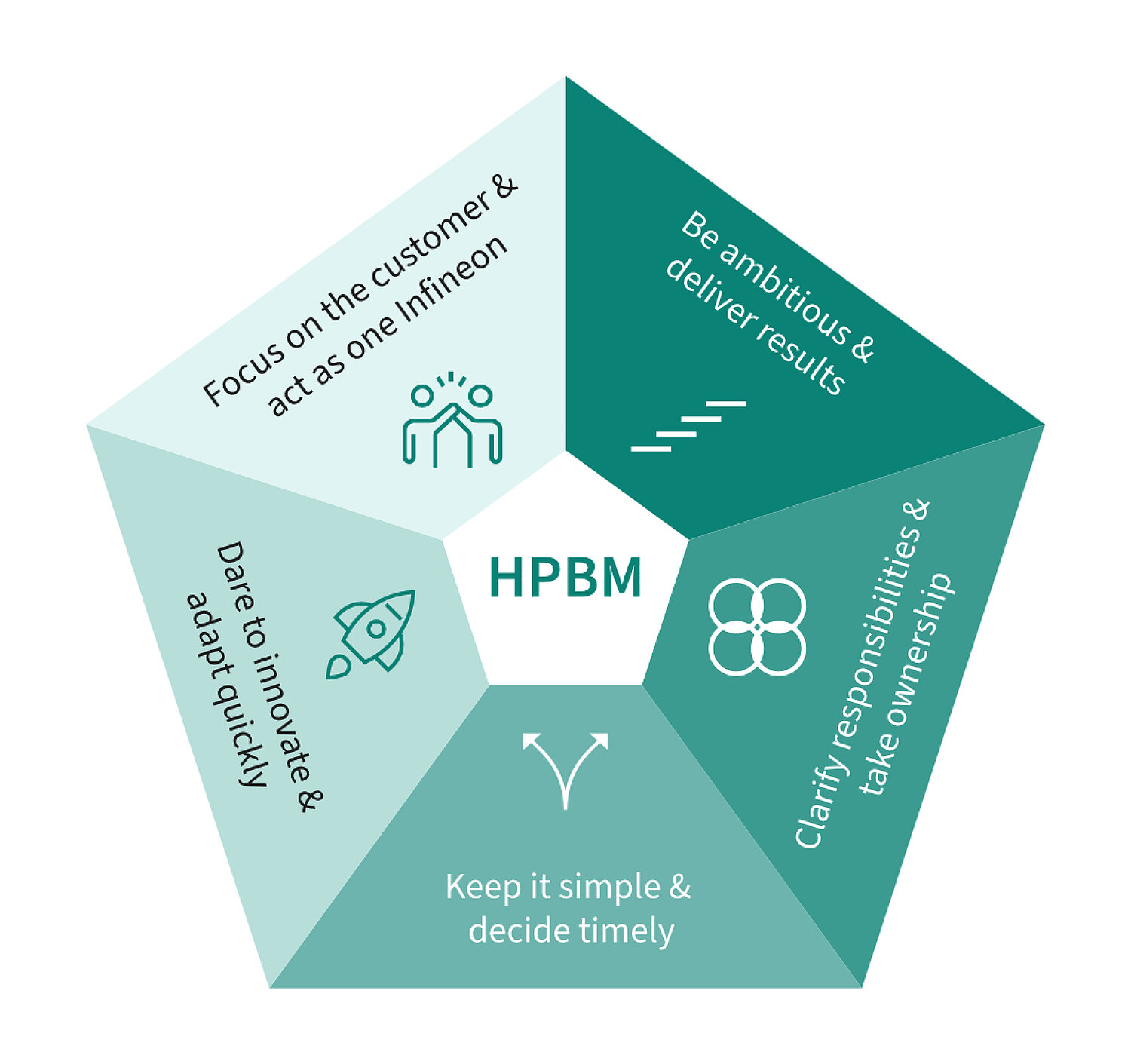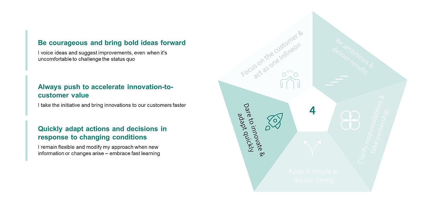 Starke Innovationskraft, Anpassungsfähigkeit und eine reibungslose, kundenzentrierte Zusammenarbeit entlang der Wertschöpfungskette sind angesichts des scharfen Wettbewerbs im Halbleitermarkt wichtige Erfolgsfaktoren für Infineon. Sie werden auch von individuellem Verhalten maßgeblich mitbestimmt, u.a. im Hinblick auf schnelle, mutige Entscheidungen, Offenheit für Lernen und Innovation sowie eine proaktive Kundenorientierung.