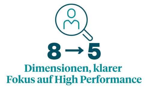 In einem Markt, der von technologischem Wandel und steigendem Wettbewerbsdruck geprägt ist, reicht es nicht, Veränderungen zu managen – sie müssen aktiv vorangetrieben werden. Diese Dimension übersetzt genau das in konkretes, alltagstaugliches Verhalten: schnell auf neue Bedingungen reagieren, Innovationen konsequent zum Kunden bringen und den Status quo nicht als Ausgangspunkt, sondern als Herausforderung begreifen. Drei Verhaltensanker – klar formuliert und direkt anwendbar.